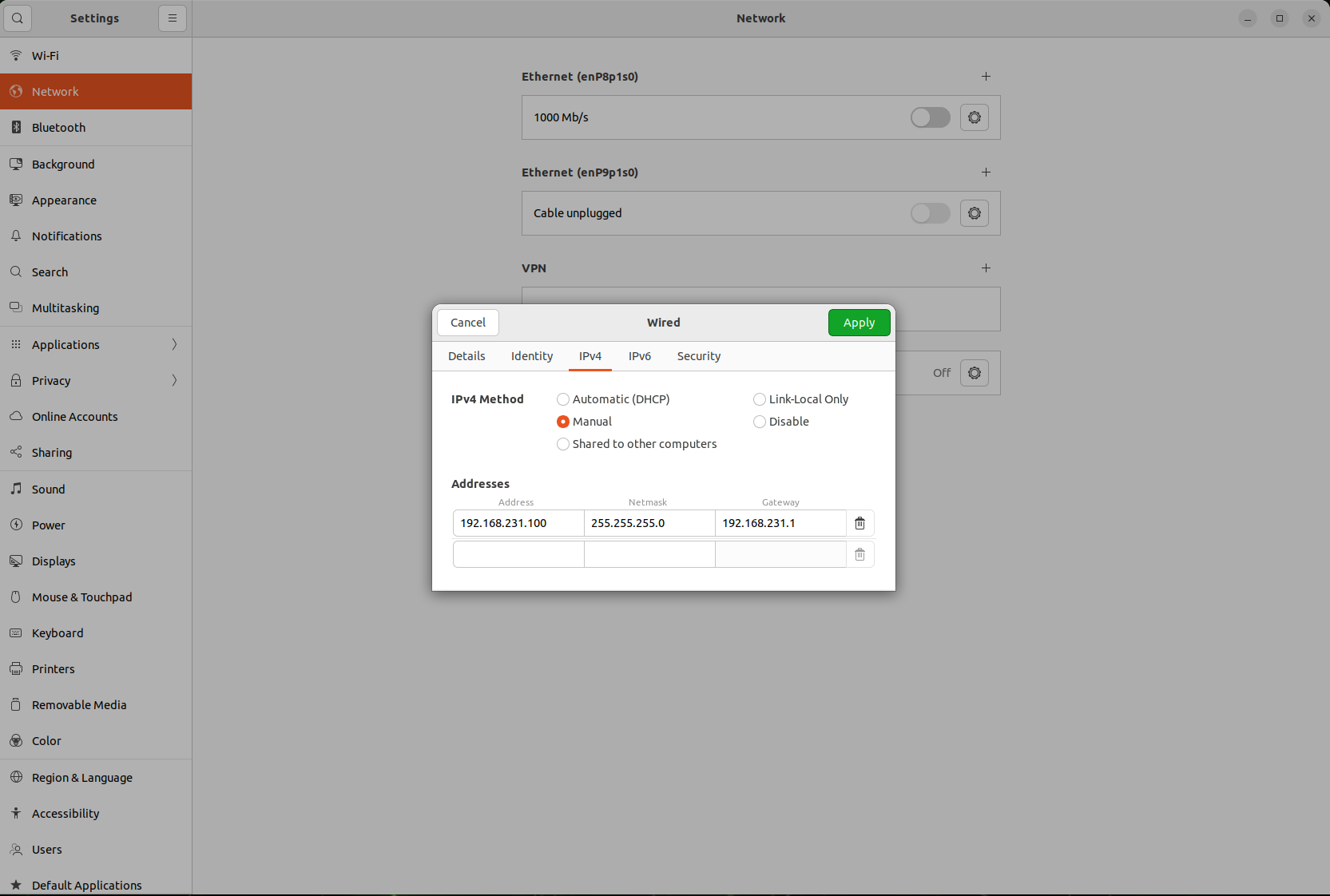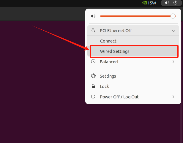 1. 点击桌面右上角 Ethernet → 选择 "Wired Settings"
